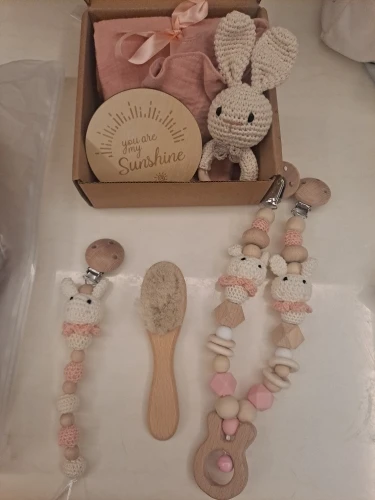 Keywords: Geschenke-Set, Musselintuch, Halstuch, Rassel, Schnullerkette, Bürste, Meilenstein